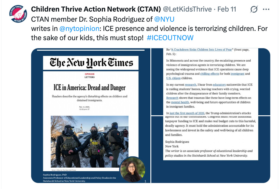 Restore sensitive location protections. Schools, hospitals, child care centers, and houses of worship must be off-limits for enforcement. When children fear that going to school will lead to their parent’s arrest, they stop going to school. The research confirms this. It is already happening.