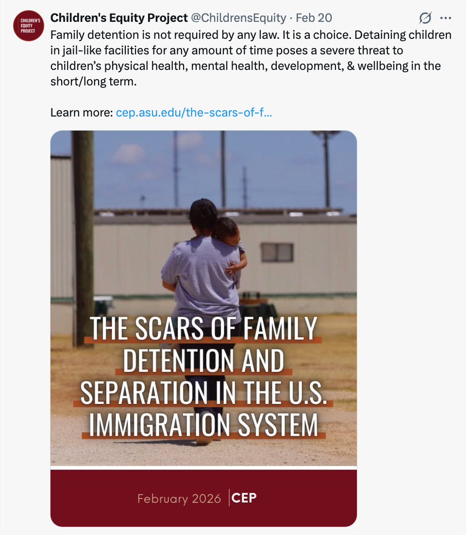 In February, researchers at Arizona State University’s Children’s Equity Project published a new report titled The Scars of Family Detention and Separation in the U.S. Immigration System. It opens with a statement that synthesizes the research on detention and family separation: