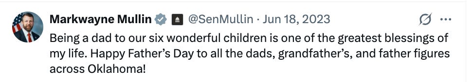 In June 2023, Mullin spoke about being a father as one of the “greatest blessings of my life” and how he wanted to wish a Happy Father’s Day to “all dads, grandfathers, and father figures across Oklahoma!”