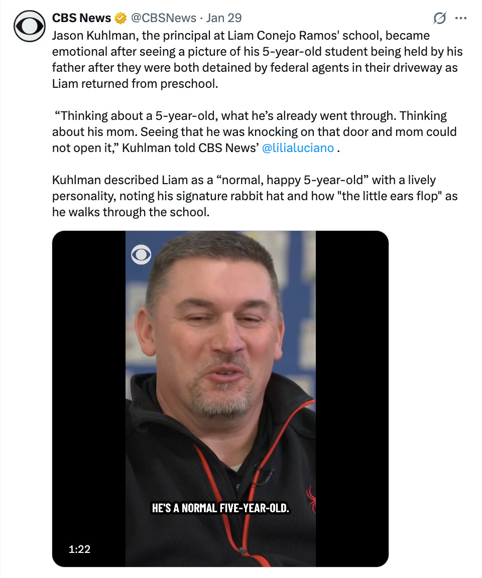 5-year-old Liam Ramos being taken away from his family, his home, his friends, his school, his friends, and his community in Minnesota to be flown over 1,000 miles away to a detention facility in Dilley, Texas;