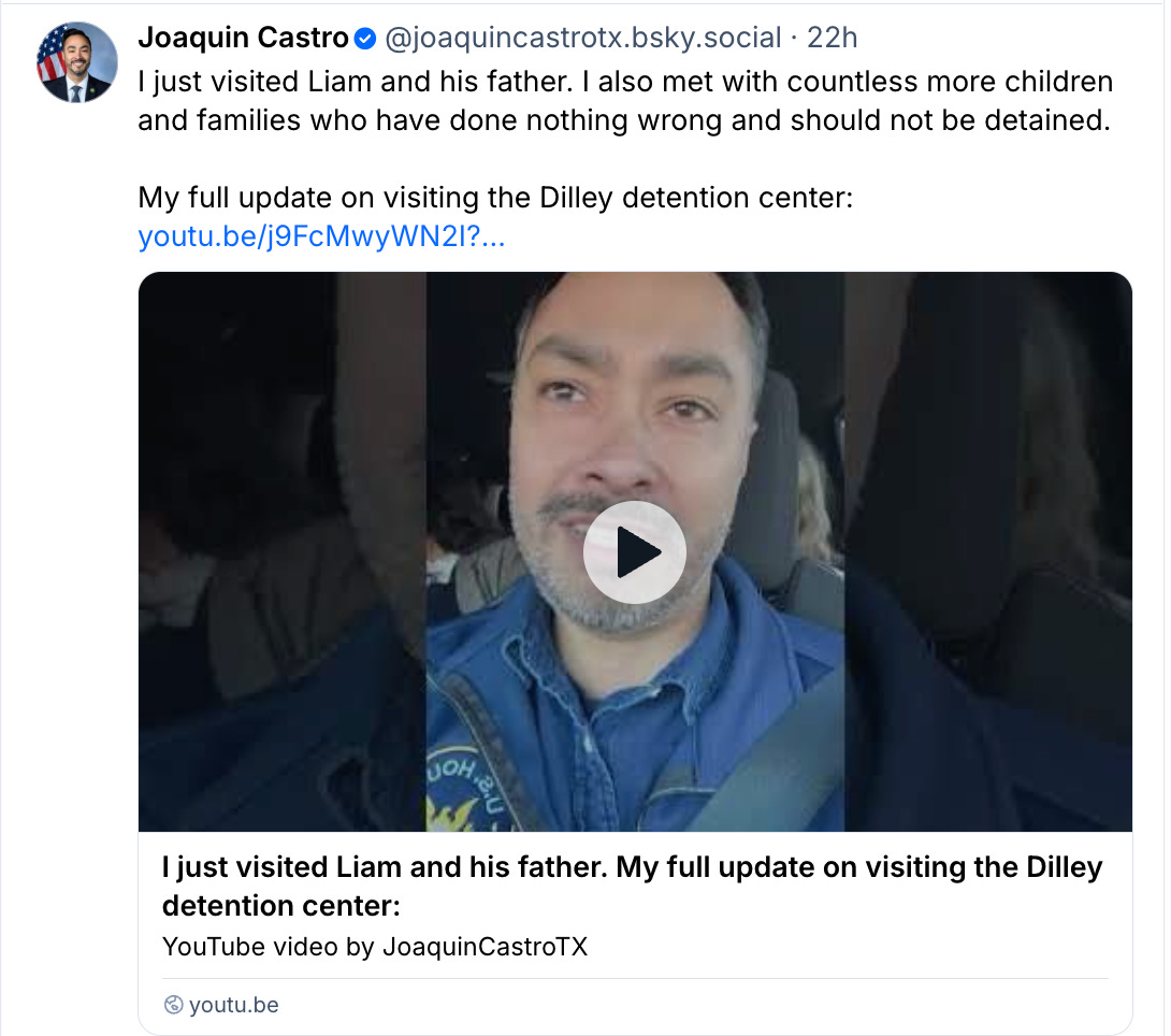 First, for those concerned about Liam Ramos and other children being detained in prison-like settings, Rep. Joaquin Castro (D-TX) went to Dilley, Texas, and met with Liam Ramos and his dad.